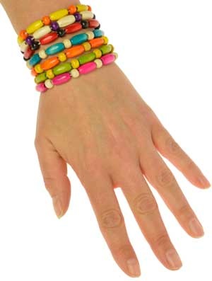 De armbandjes van hout zijn uitgevoerd in diverse kleuren en worden asssorti geleverd. Rekbaar, dus passend om elke pols!