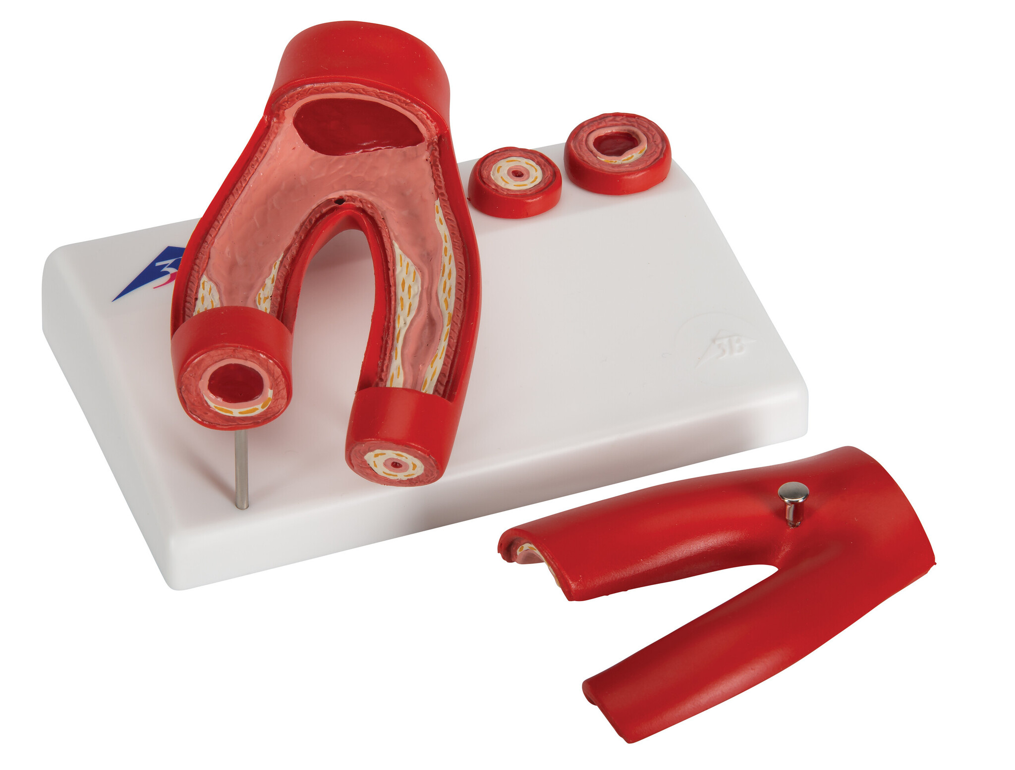 Het model toont een horizontaal doorgesneden slagadervertakking met arteriosclerotische veranderingen in vier verschillende stadia, van lichte afzetting tot een volledig verstopte bloedvaten.