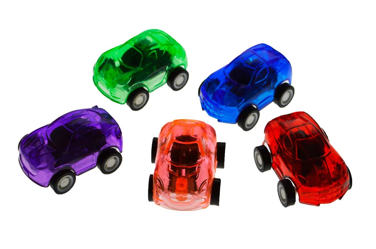 De mini autootjes transparant zijn uitgevoerd in diverse kleuren en worden assorti geleverd. Met pullback motortje.
