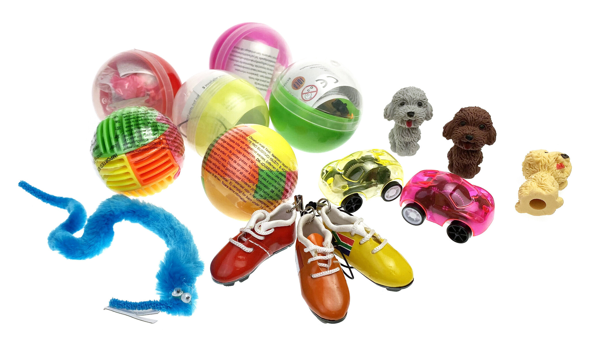 Een mooi assortiment met kinder- give aways verpakt in capsules van 45 mm, geschikt voor jongens.