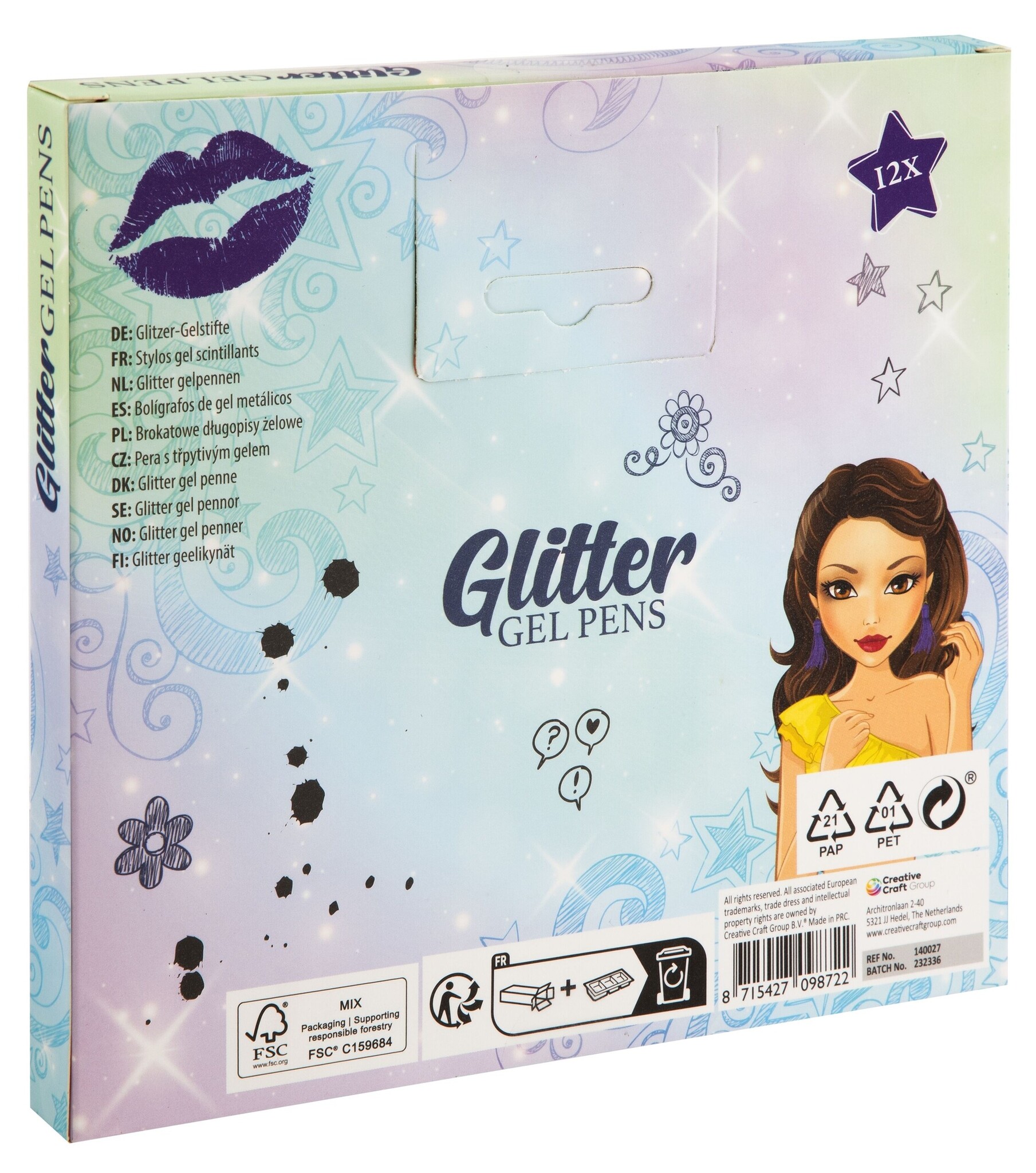 Laat creativiteit sprankelen met deze set van 12 glitter gelpennen. Perfect voor kaarten, tekeningen en versieringen! Afm. verp. 18,5 x 16,5
