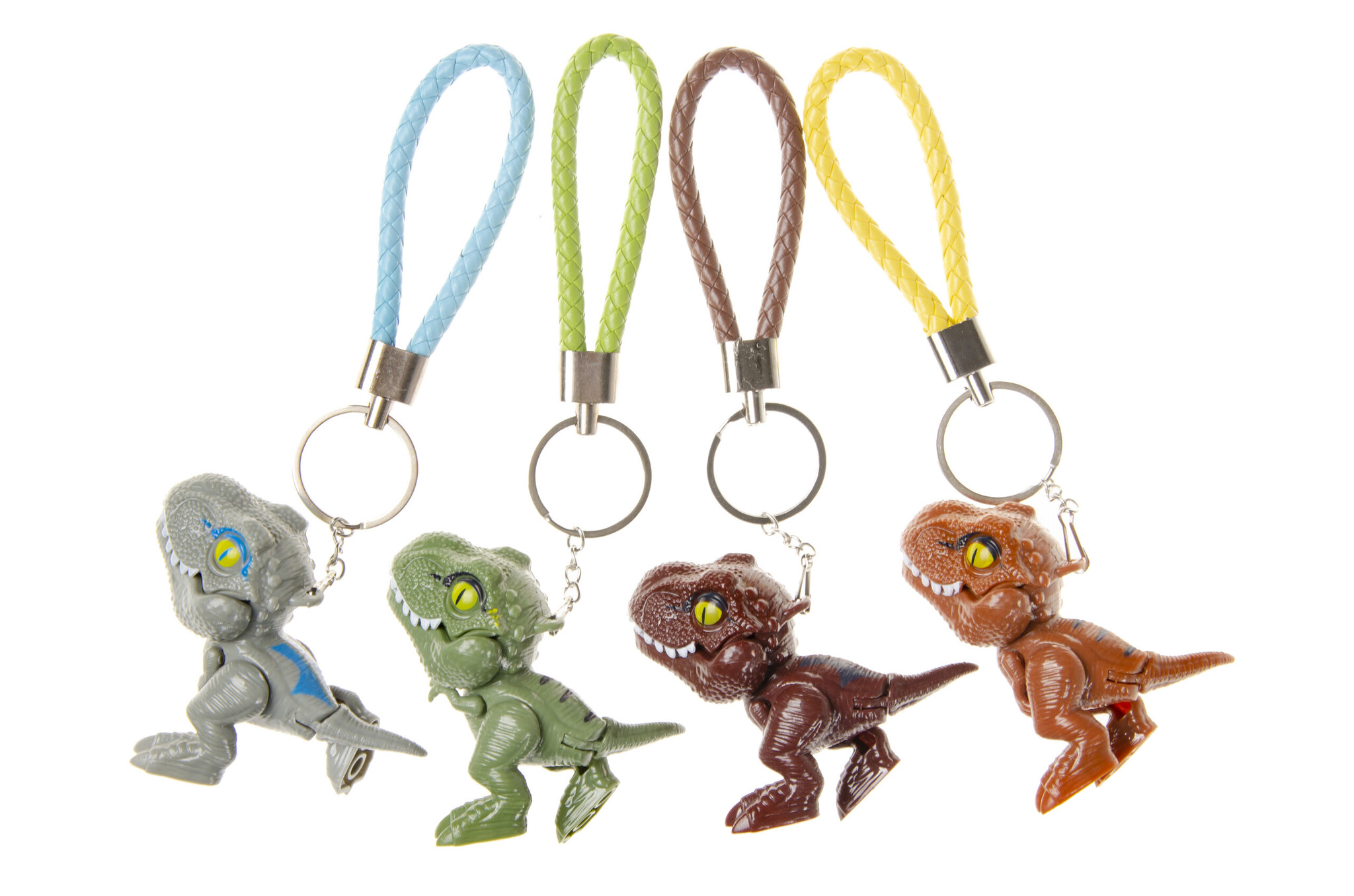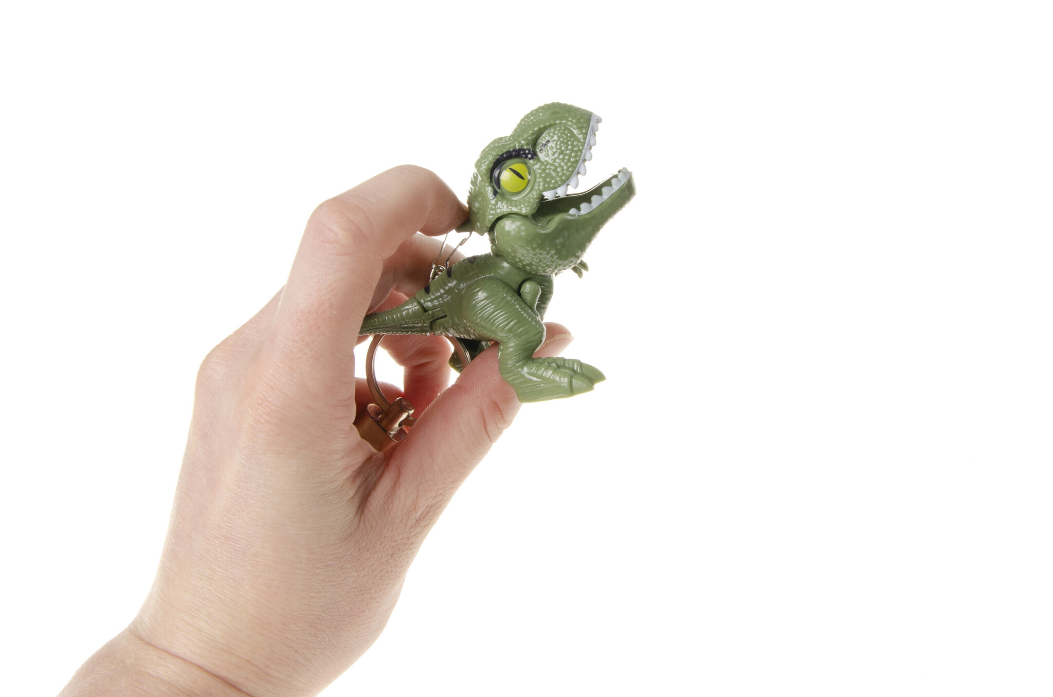 De dino heeft beweegbare pootjes en bek. In diverse kleuren, assorti geleverd. Afm.: 8 cm. Geschikt vanaf 3 jaar.
