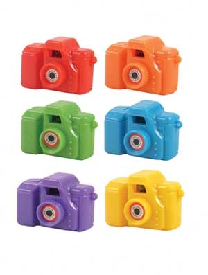 De mini cameraatjes zijn uitgevoerd in diverse kleuren en worden assorti geleverd. Afm. ca.: 4,1 x 3,3 cm.