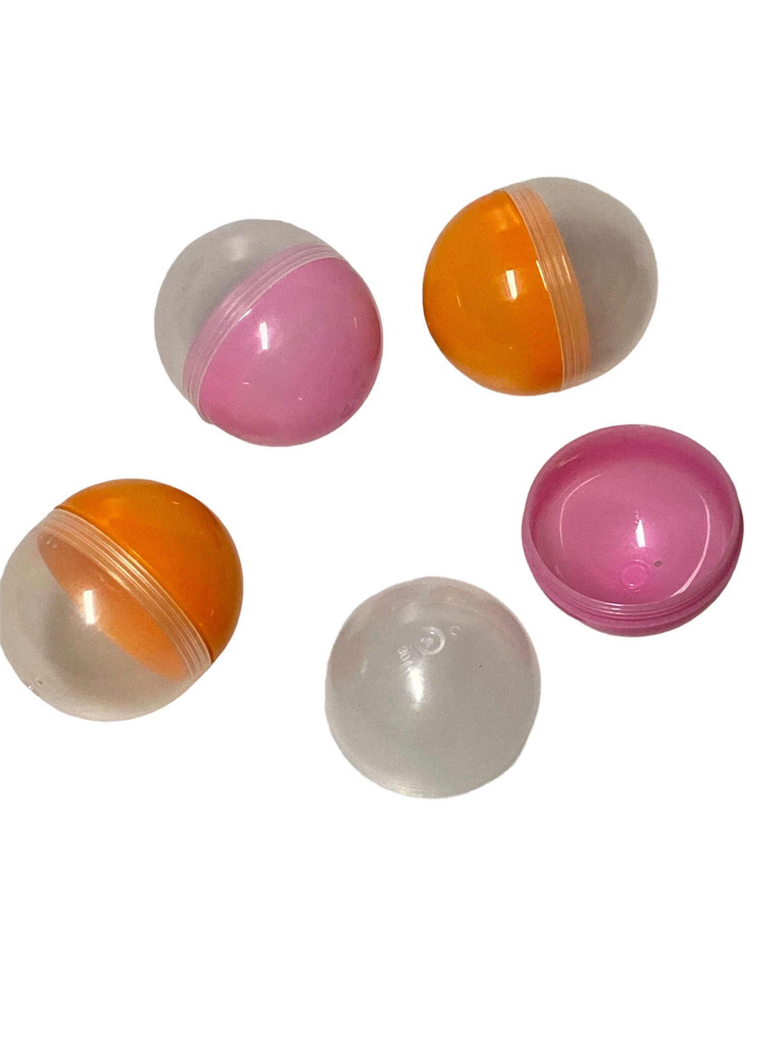 Lege capsule balletjes om zelf te vullen. Transparant van kleur met gekleurde dop roze-oranje. Afmeting 45mm.