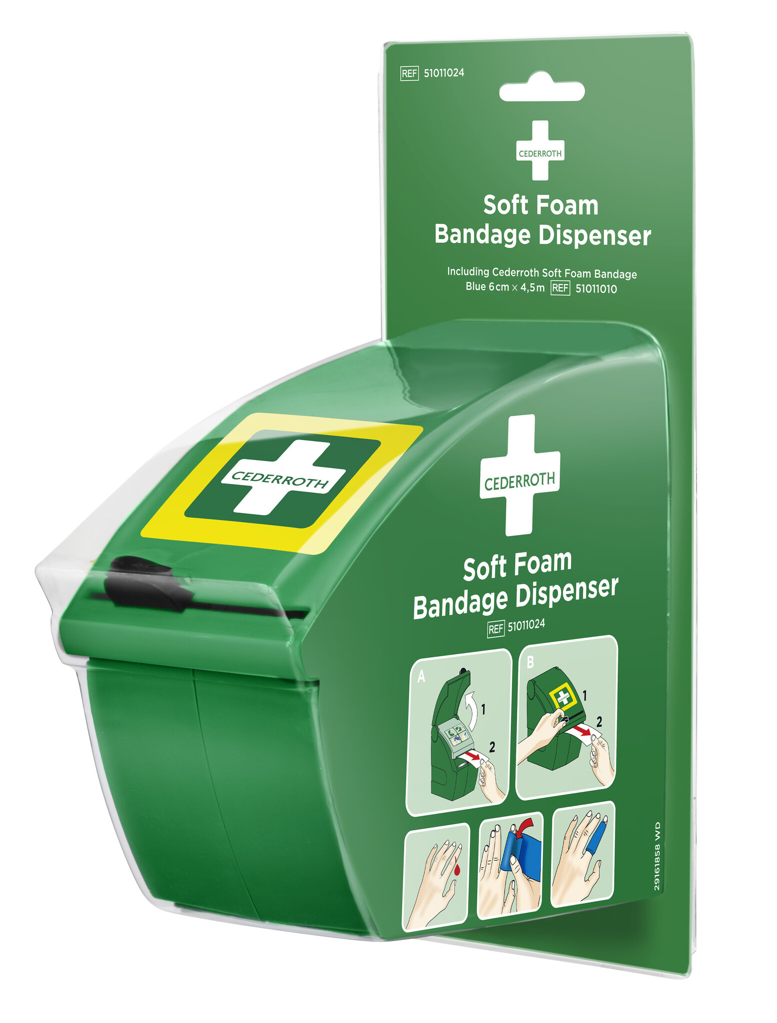Dispenser voor snelle en gemakkelijke toegang tot het pleisterverband. Incl. 1 rol Soft Foam Bandage BLAUW 6 cm x 4,5 meter. Met geïntegreerd mesje om het makkelijk af te kunnen snijden. Geschikt voor zowel wandbevestiging als losstaande dispenser.