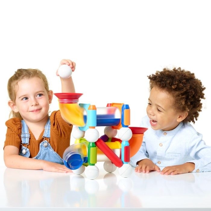 Een speeltuin van buizen voor iedereen die van ballenbanen houdt. Bouw de gekste constructies en laat de ballen maar rollen.