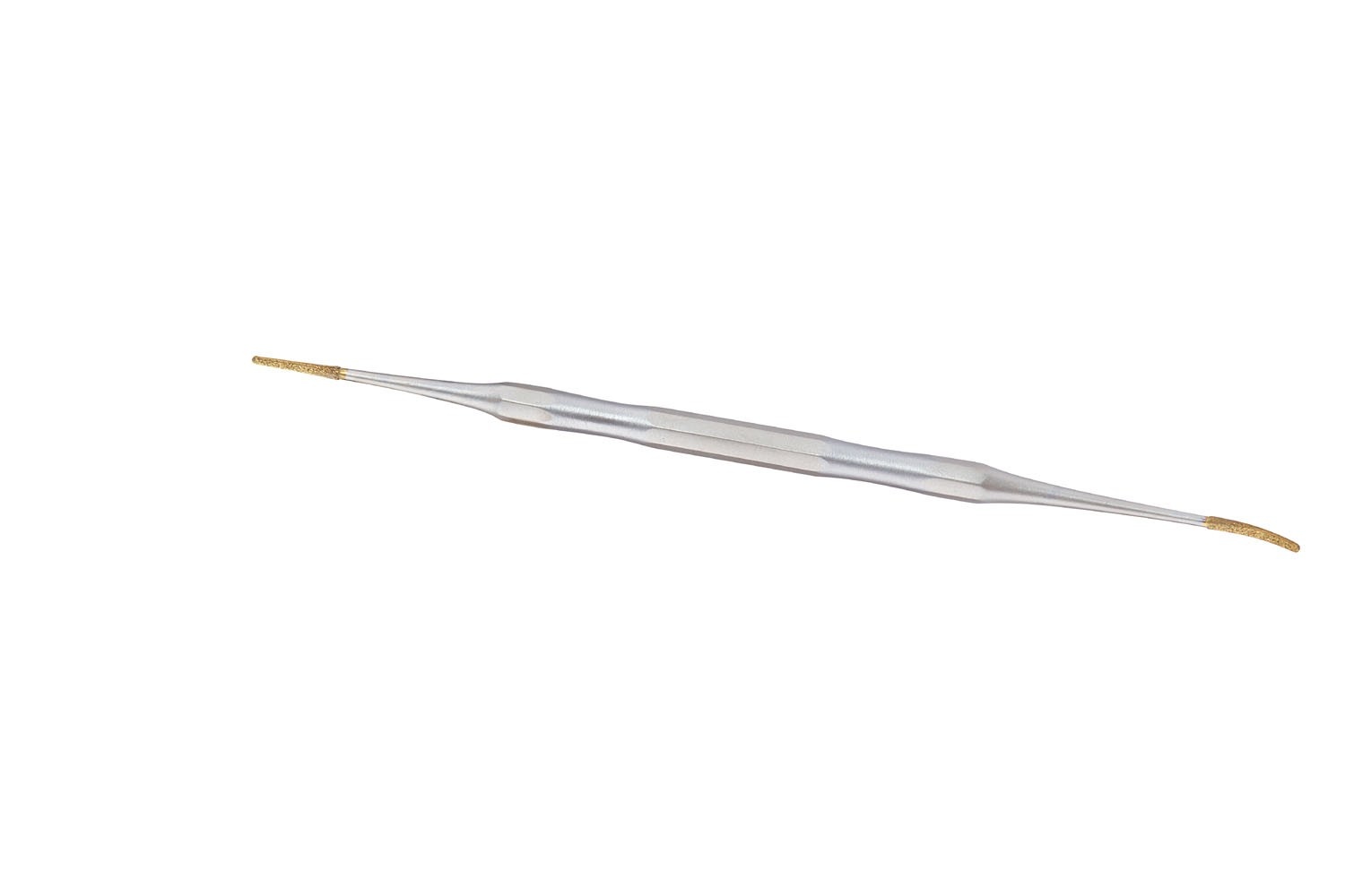 Dubbele hoekvijl met aan 1 zijde een gebogen vijltje en 1 zijde een rond vijltje. Met diamant coating. Voor het behandelen van kleine onregelmatigheden aan de nagel. Geschikt om onder de nagel en dieper liggende delen te kunnen werken.