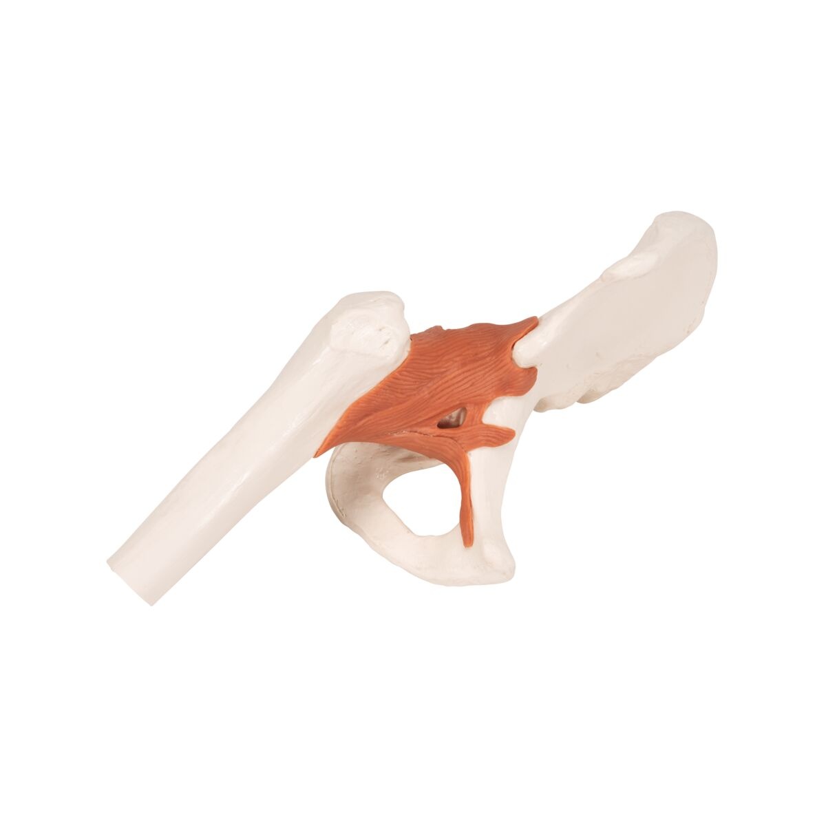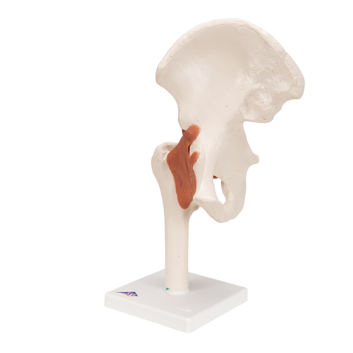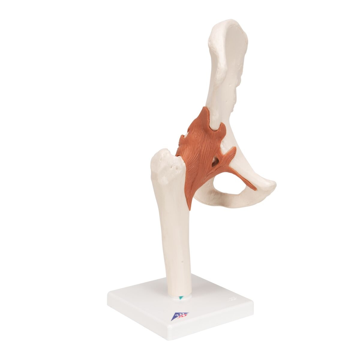 Volledig flexibel heupgewricht, te gebruiken voor demonstratie van; abductie (zijwaartse, afvoerende beweging), anteversion (vooroverkanteling), retroversie (achteroverbuiging), interne/externe rotatie, etc. Bevestigd op een standaard.