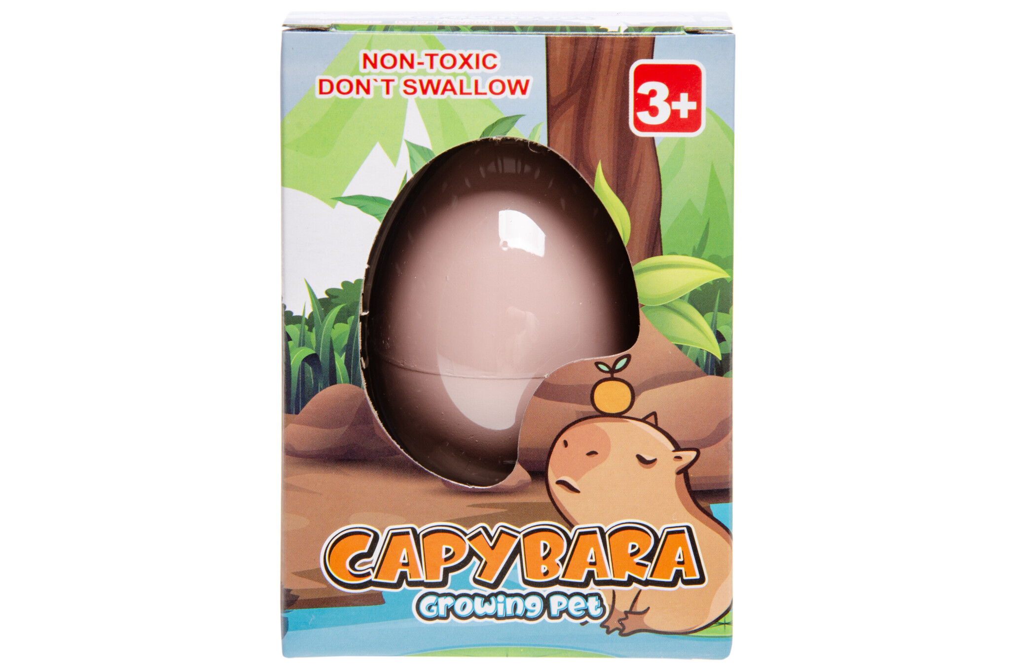 Leg het ei in water en zie een Capibara uit het ei groeien. Elke dag een beetje groter! Afm. ei: 6,75 cm. Geschikt vanaf 3 jaar.