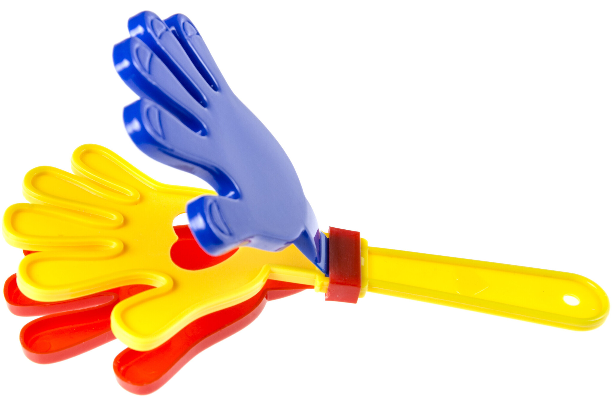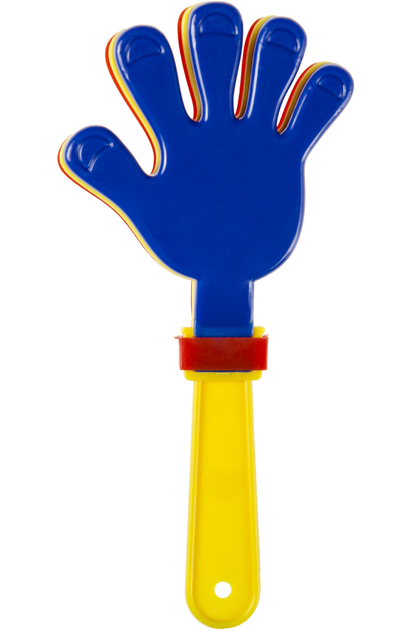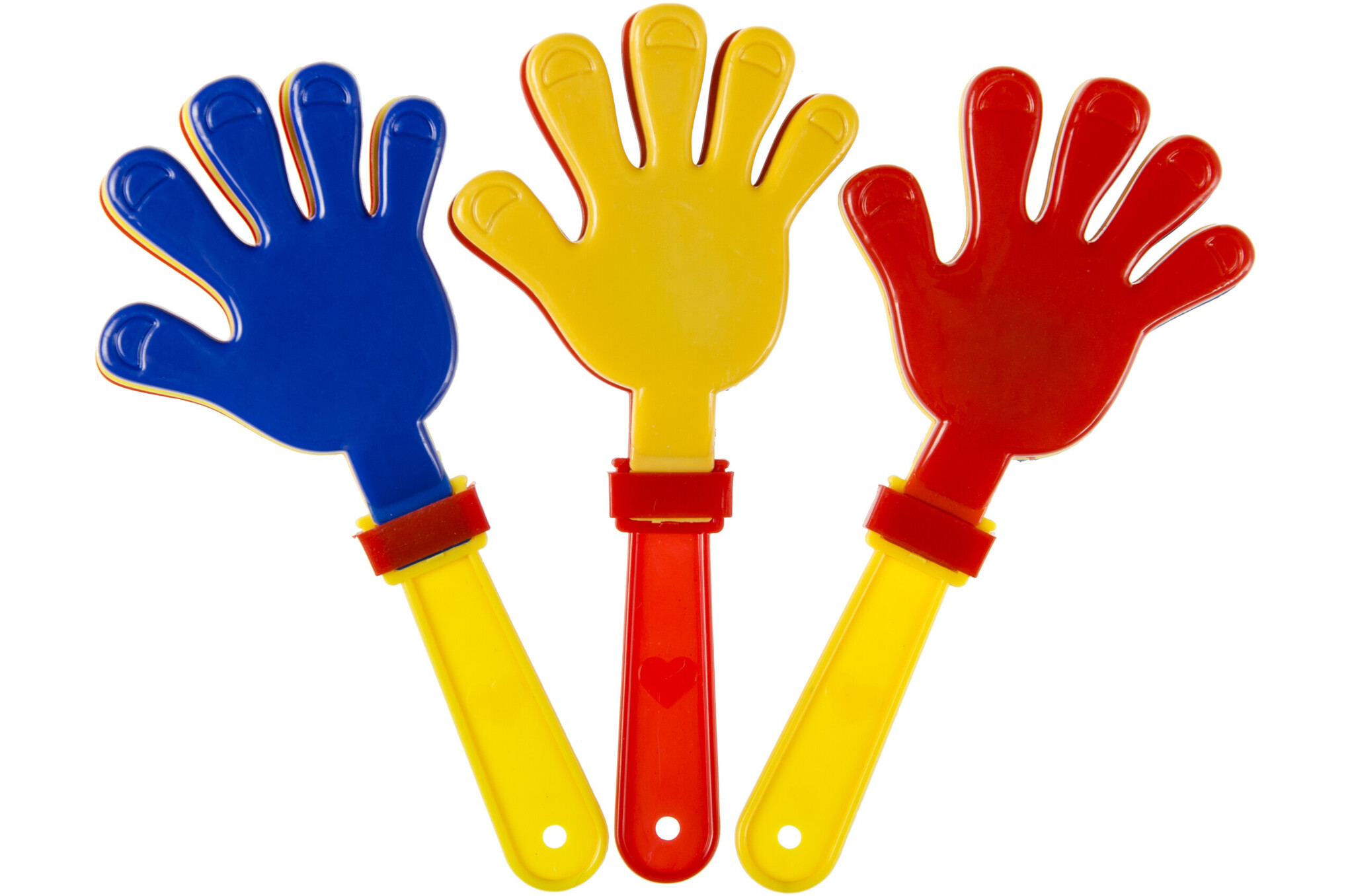 De handenklappers zijn uitgevoerd in de kleuren: rood, geel en blauw en worden willekeurig geleverd. De klapper handjes zijn ongeveer 15 cm groot.