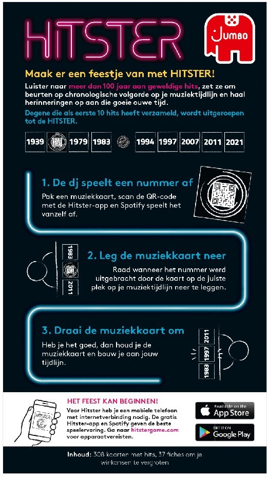 Maak er een feestje van met Jumbo Hitster! Met meer dan 300 van de grootste hits van de afgelopen 100 jaar is Hitster het perfecte partyspel voor een avond lachen, zingen dansen en het delen van herinneringen.