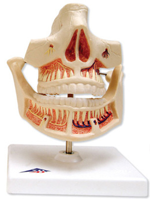 Tandwortels, bloedvaten en zenuwen zijn zichtbaar. De onderkaak is beweegbaar.