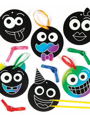 Kras je eigen design op deze stoere smiley hangers! Door ze met het krasstokje te krassen verschijnen prachtige kleuren! Doe er daarna een bijgeleverd lintje aan en hang het ergens op! Afm. ca. 8,5 cm.