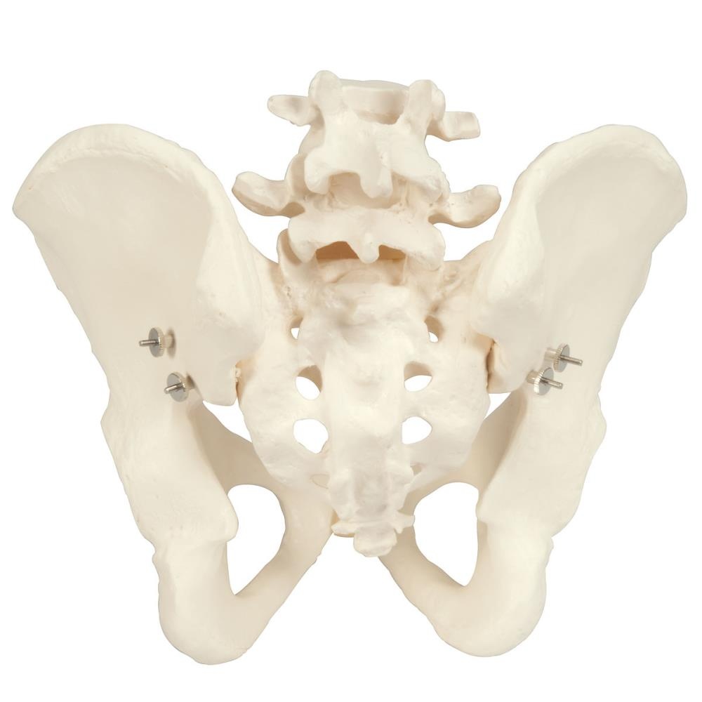 Anatomisch model van het mannelijk bekken. Bestaand uit heupbot, heiligbeen(sacrum) met staartbeen(coccygis) en twee lumbale wervels.