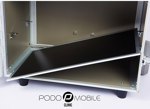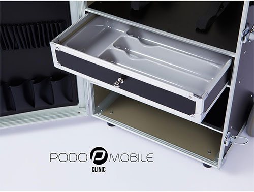 Tevens heeft de PodoMobile in haar open slaande deuren diverse uitneembare instrumenten houders die d.m.v. klittenband vast gemaakt worden, deze kunnen in zijn geheel op de open draaibare instrumententafel geplaatst worden.