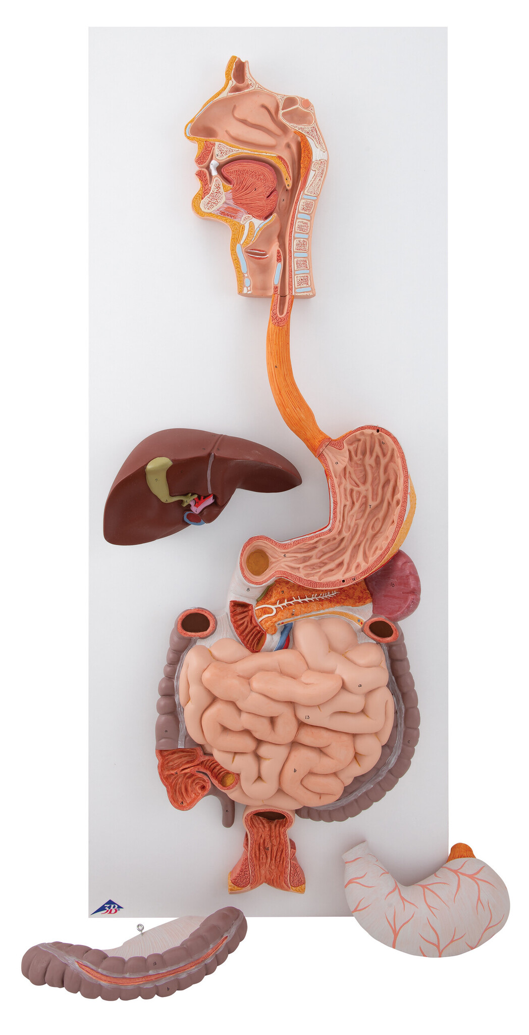 De twaalfvingerige darm (duodenum), blindedarm (caecum) en endeldarm (rectum) zijn geopend om de interne structuren te tonen. De dwarse dikke darm (colon transversum) en de voorwand van de maag zijn afneembaar, zodat de anatomie van het spijsverteringsstelsel gedetailleerd kan worden bestudeerd.