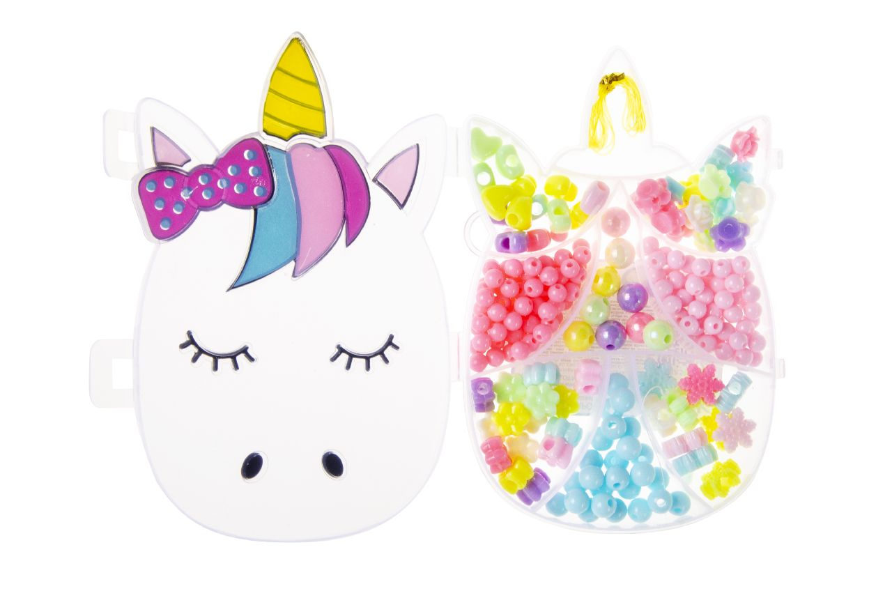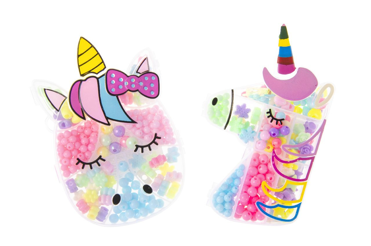 Schattig doosje in de vorm van een eenhoornhoofd gevuld met mooie kralen en draad om je eigen sieraden te maken.