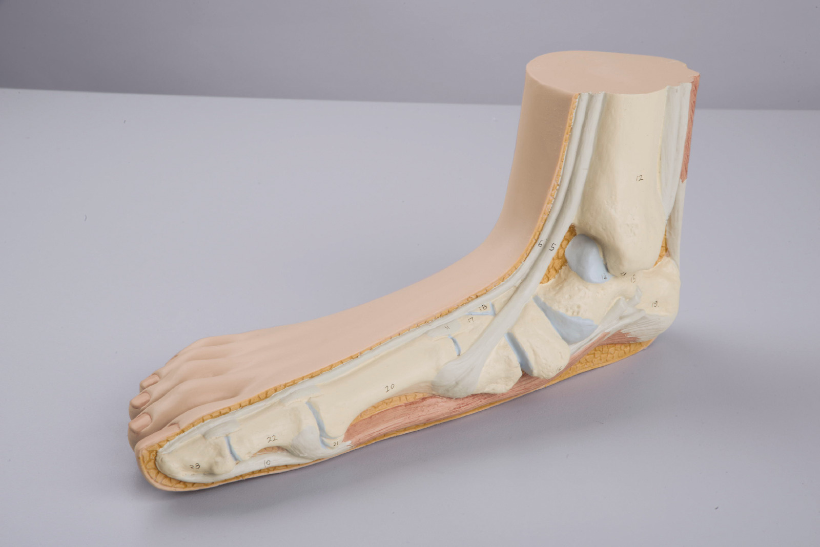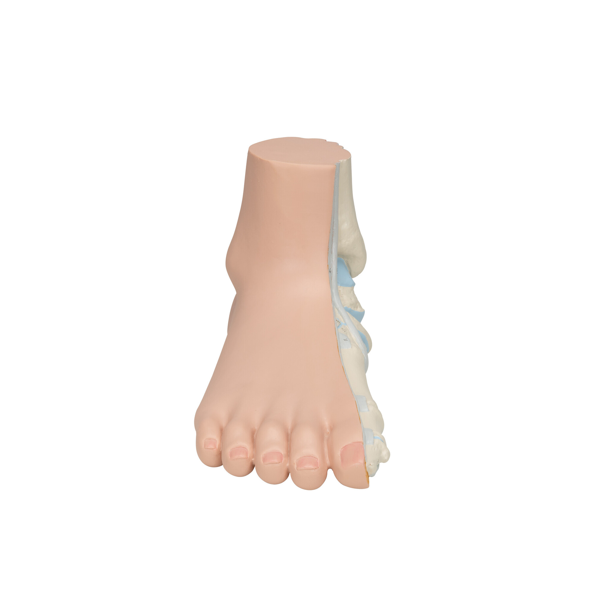 In dit hoogwaardige model worden de oppervlakkige structuren van een platte voet getoond. De interne botten, spieren, ligamenten en zenuwen zijn ook vertegenwoordigd.