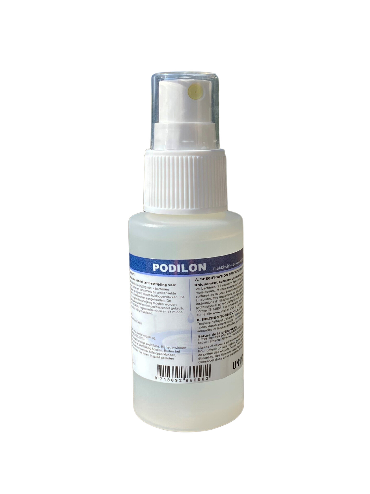 Podilon is een vloeistof op basis van ethanol ( alcohol 80%) en is uitermate geschikt voor het desinfecteren van kleine ( intacte) huidoppervlakken.