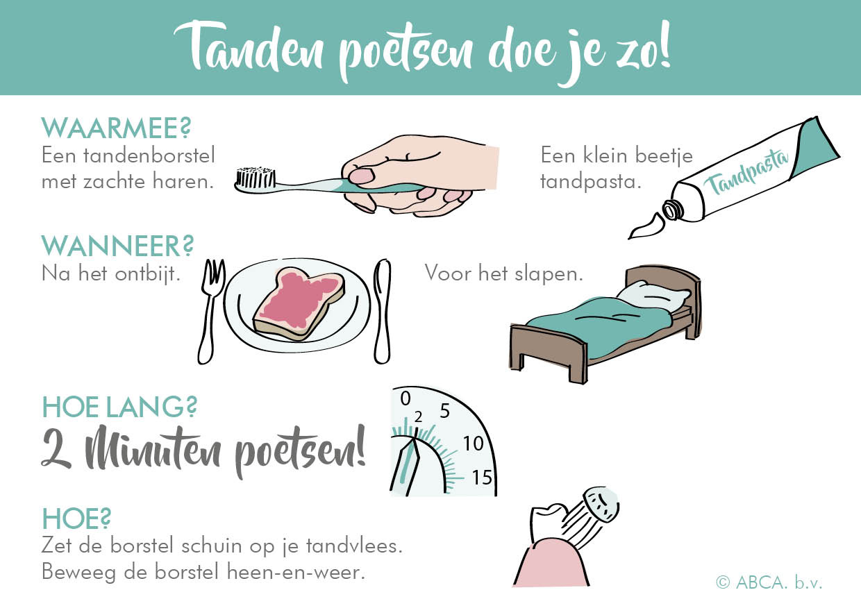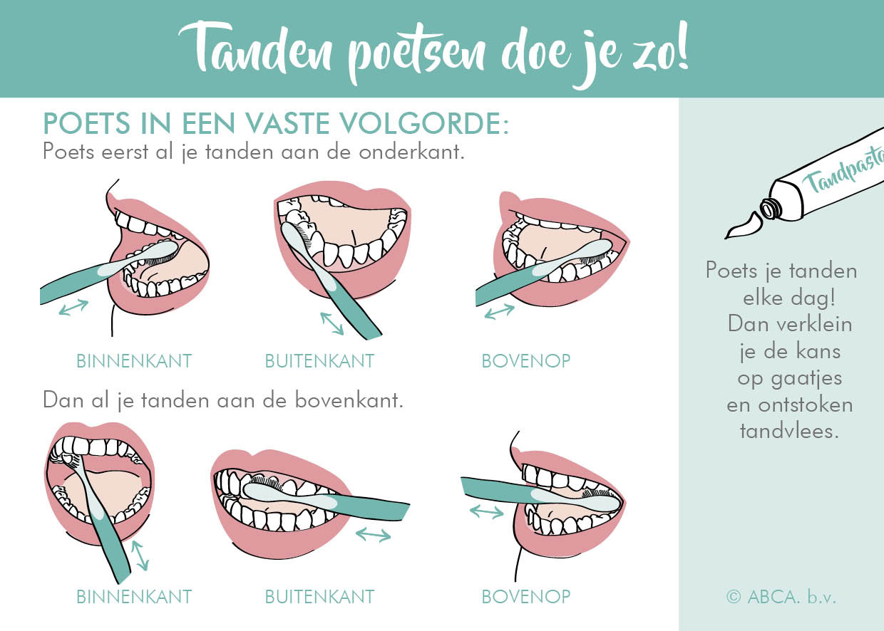 Met dit stevige kaartje kan de patiënt thuis tijdens het tanden poetsen het juiste stappenplan volgen!