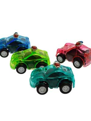 Even achteruit trekken en het politie autootje rijdt vanzelf de kamer door. De autootjes zijn zo'n 4,5 cm groot en ze zijn transparant, zodat je het pullback-mechanisme kunt zien. Ze worden in willekeurige kleuren geleverd.