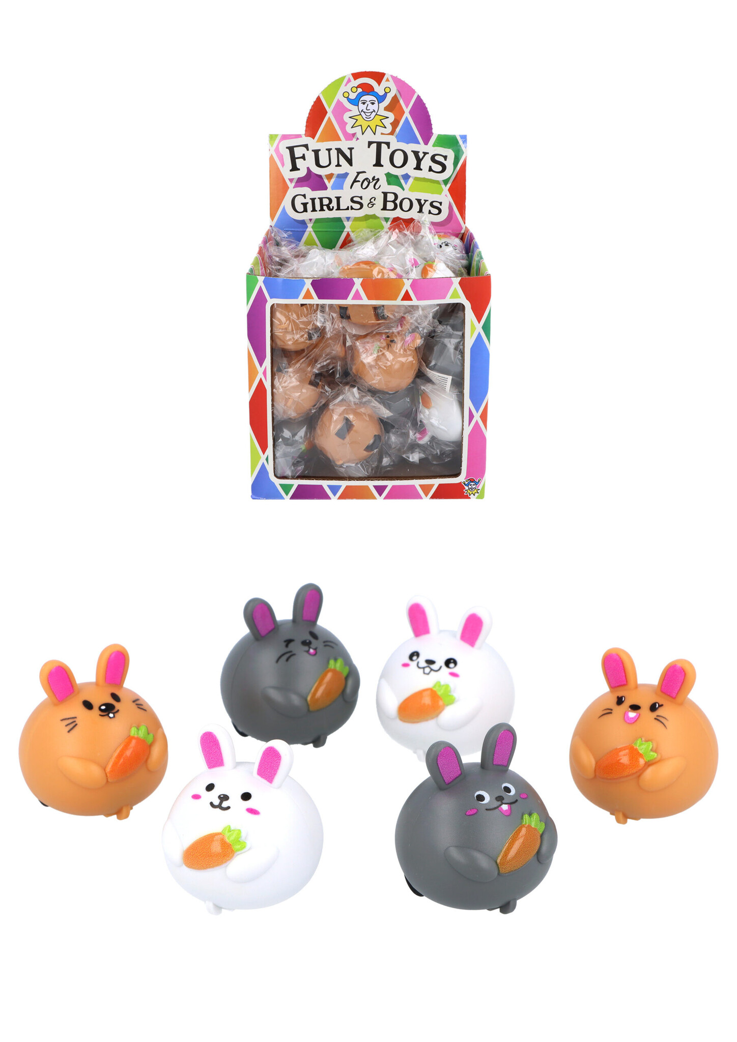 Deze schattige konijntjes (ca. 4 cm) kunnen écht rijden! Trek ze naar achteren en zie ze 'wegracen'. Assorti geleverd.