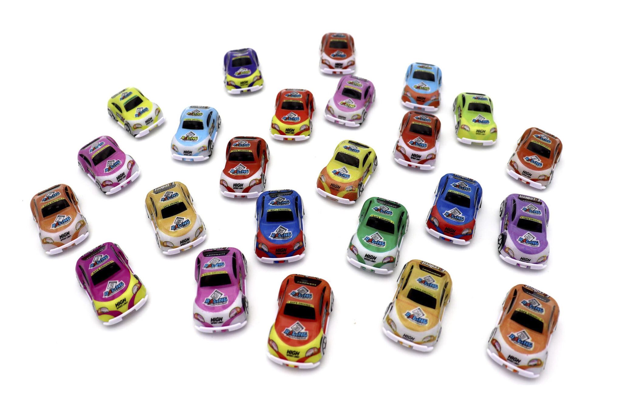 Mooie autootjes met pull back functie. Assorti kleuren geleverd. Afm. ca. 5 cm.