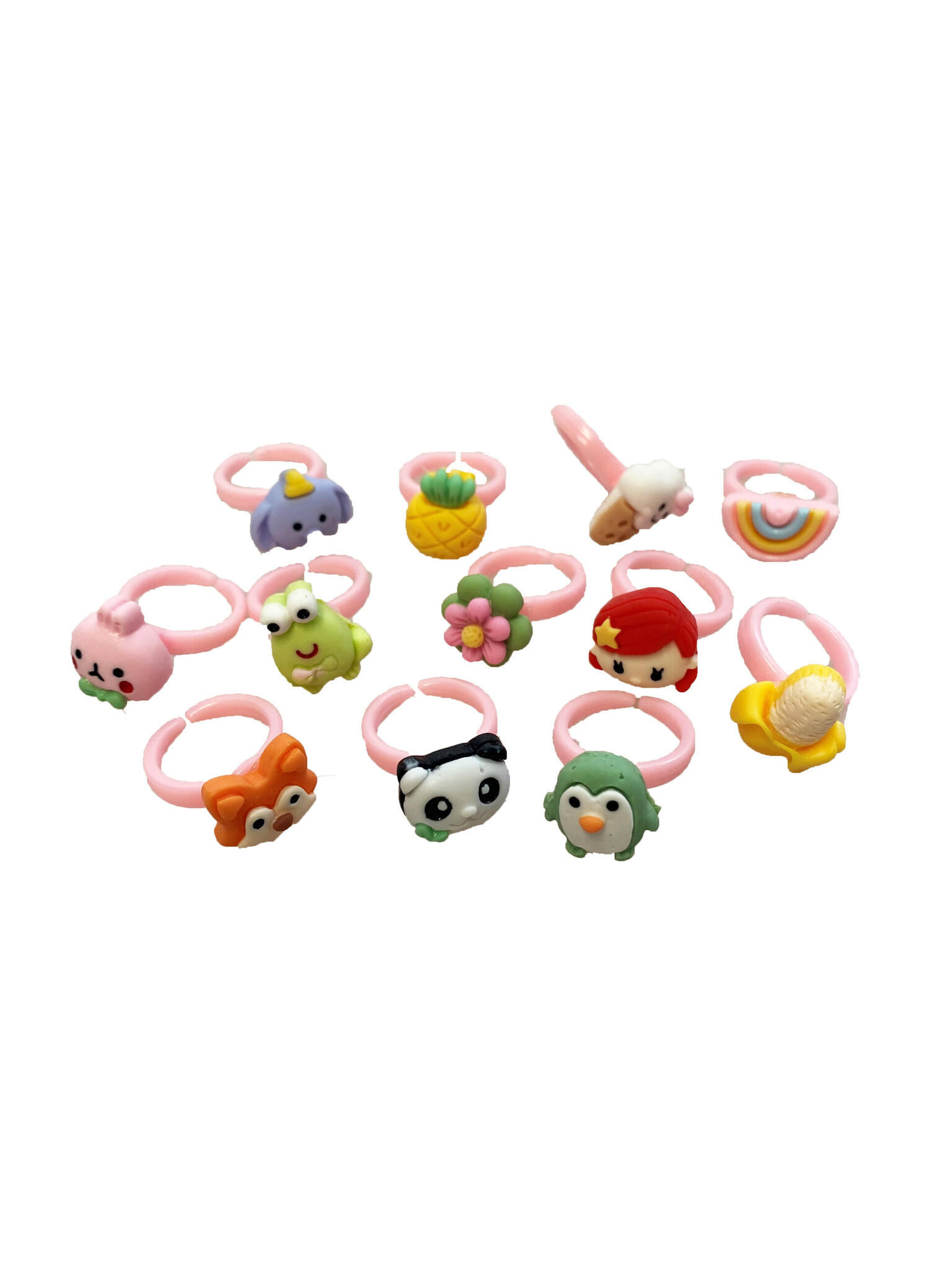 Ringetjes met diverse kleine schattige figuurtjes. Assorti geleverd. Met open deel waardoor deze beter passend is voor de vingers van het kind.