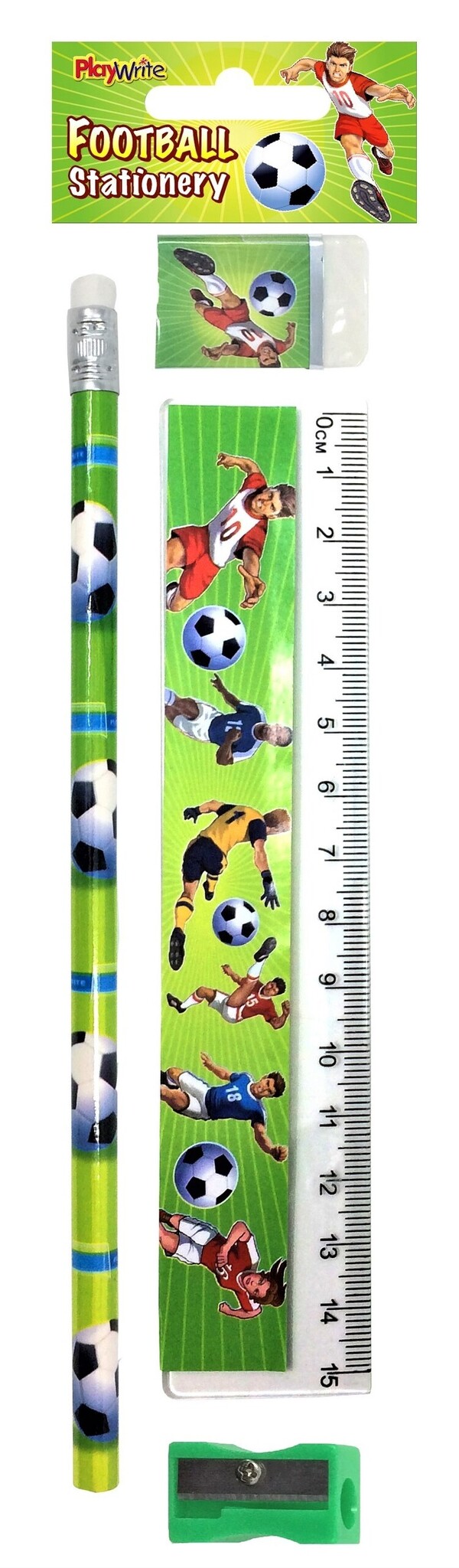 4- Delige schrijfset bestaande uit potlood, gum en lineaal. Allen uitgevoerd in voetbal thema!