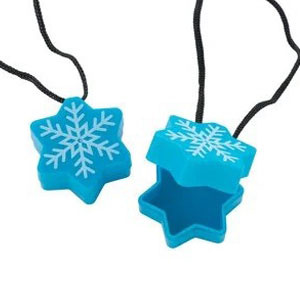 Het doosje heeft de vorm van een sneeuwvlok en is voorzien van een koord, zodat het eenvoudig omgehangen kan worden.