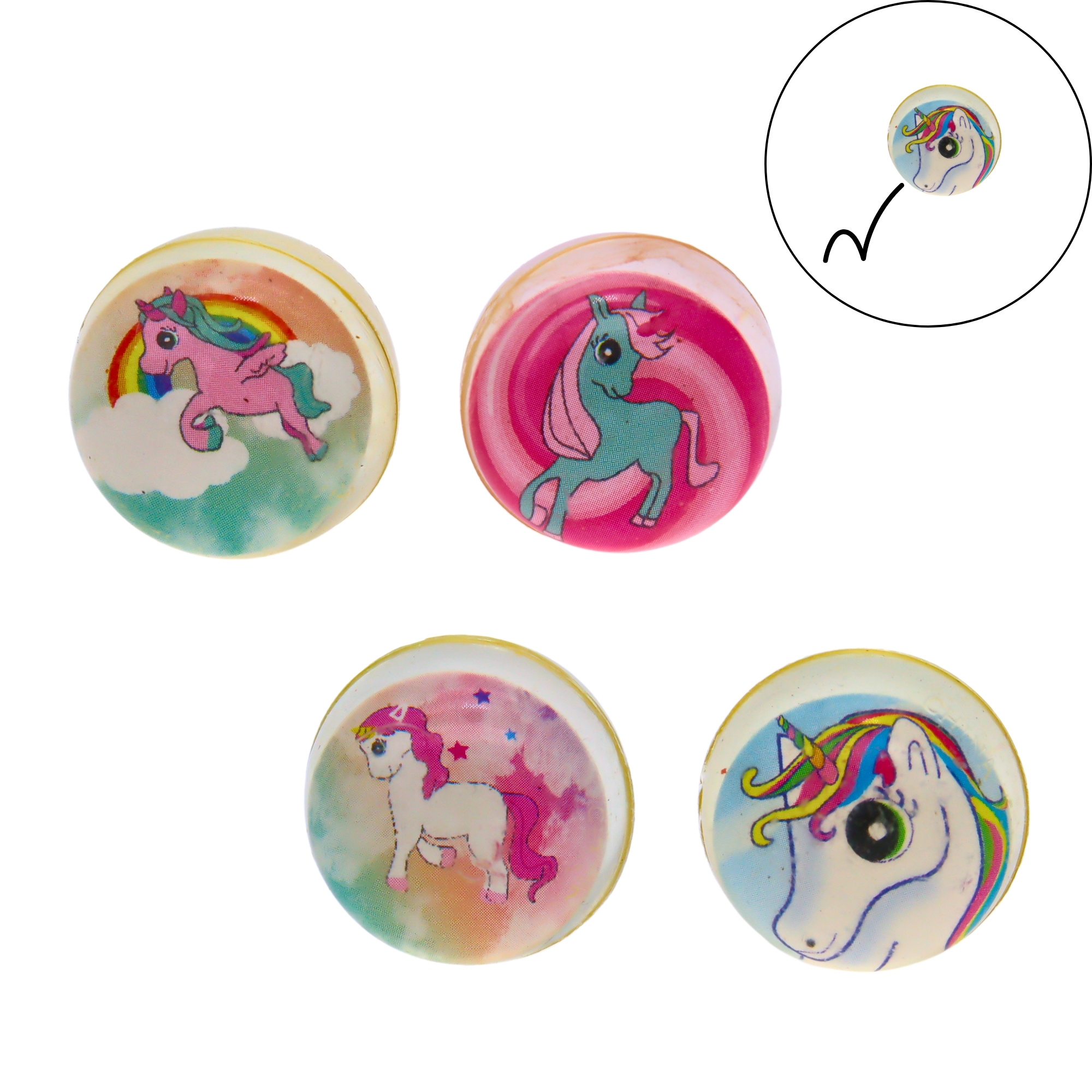 Bounce erop los met deze mooie stuiterbal eenhoorn! In diverse designs, assorti geleverd. Doorsnede stuiterbal ca. 3 cm.