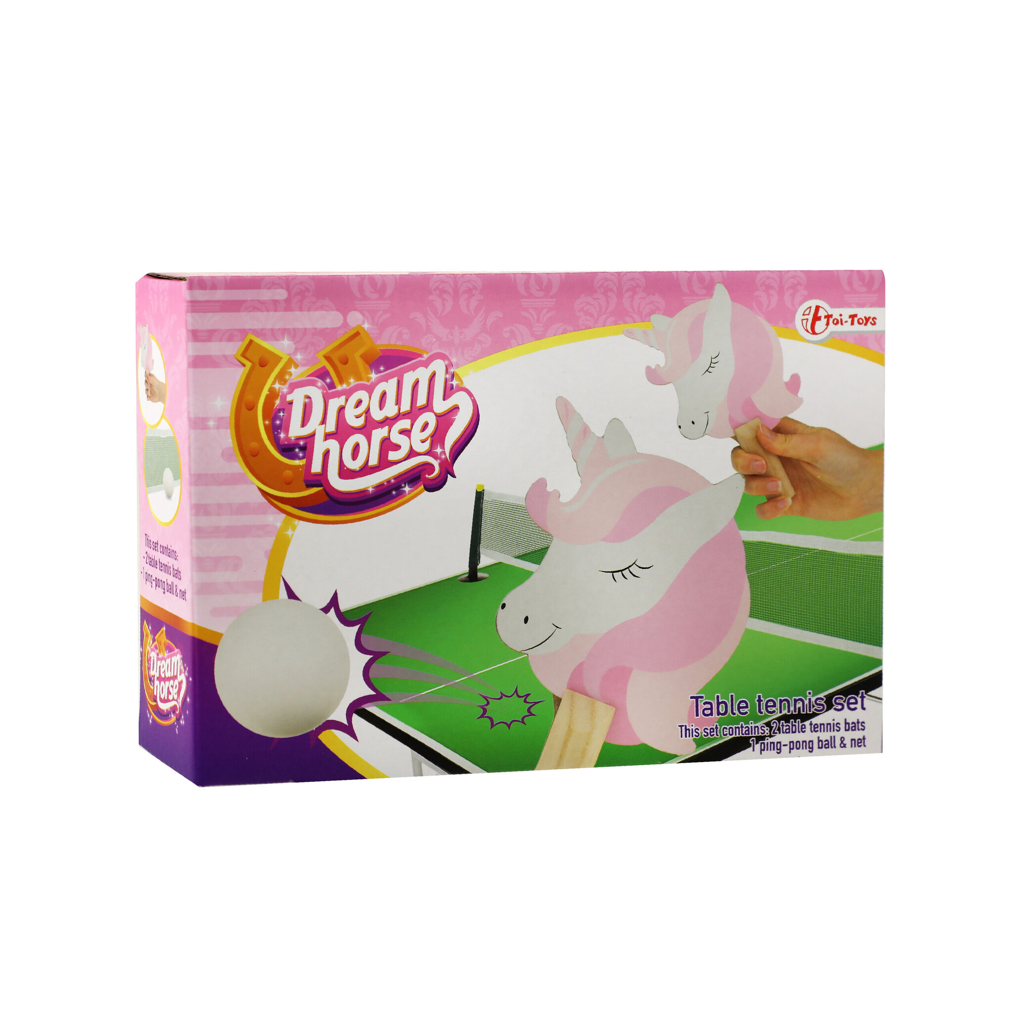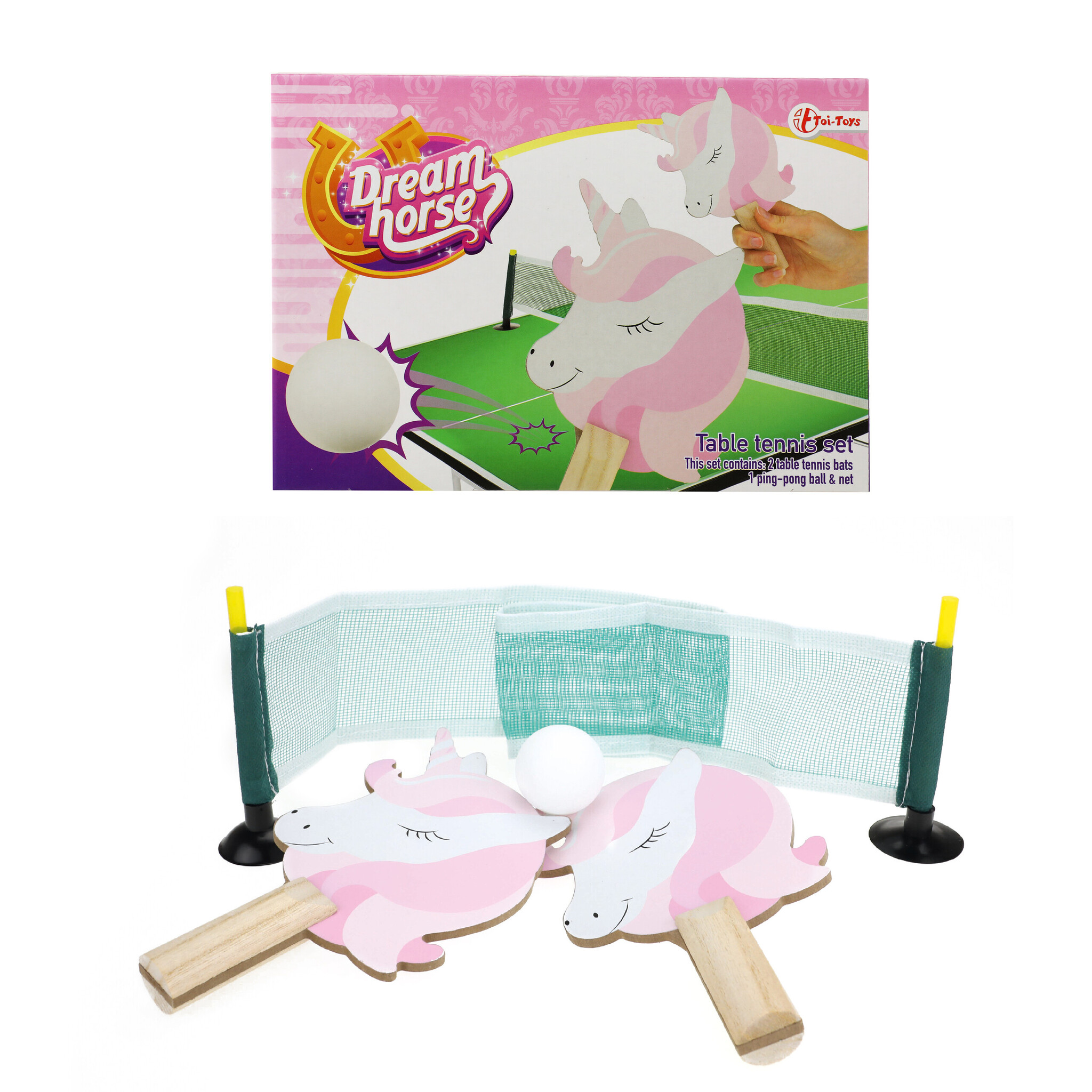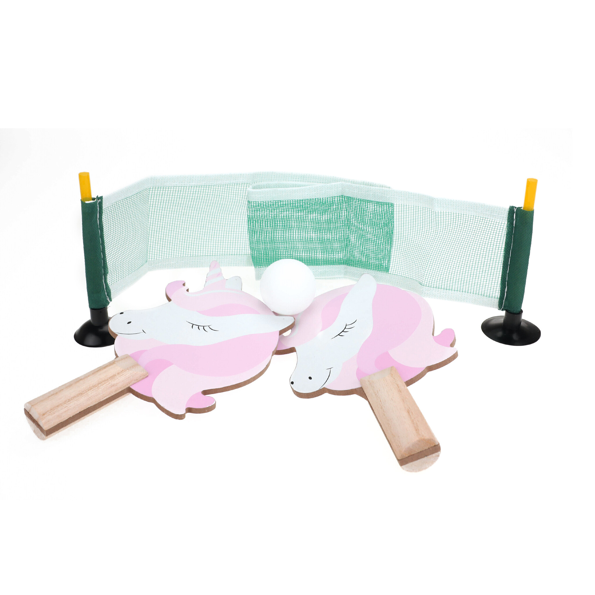 Voortaan kan jij altijd en overal tafeltennis spelen! Deze set bevat twee eenhoornbats, 1 ping-pong bal en een netje.