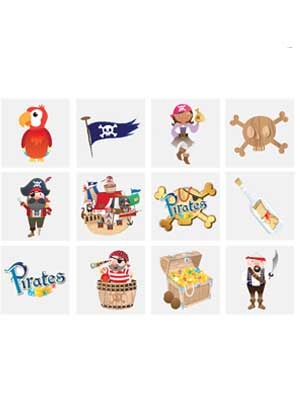 Deze kindertattoos zijn huidvriendelijk en eenvoudig weer te verwijderen met water of zeep. De verschillende piraten afbeeldingen worden willekeurig geleverd. Afm. ca.: 4,5 x 4,5 cm.