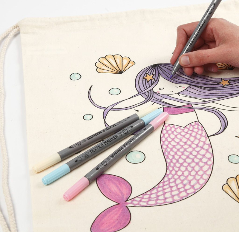 Goede kwaliteit, sterke, permanente textielstiften met dubbele punt. Schudden voor gebruik. Na fixatie wasbaar op 40°C.