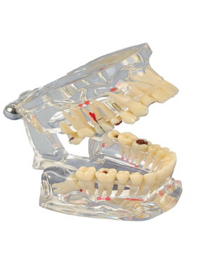 - bovenkaak: en verstandskies met distale cariës, een over geërupteerde verstandskies vanwege een ontbrekende antagonist, een eerste molaar met granuloom en wortelpuntontsteking door cariës profunda. Een eerste praemolaar op metalen pin, een tweede praemolaar met opbouw, twee andere praemolaren met cariës profunda interdentaal, boven incisieven met linguale cariës, een kroonrestauratie op een hoektand en een gebroken tweede incisief;