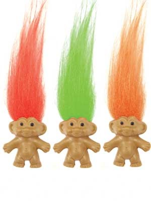 De trollen zijn uitgevoerd met diverse kleuren haar en worden assorti geleverd.