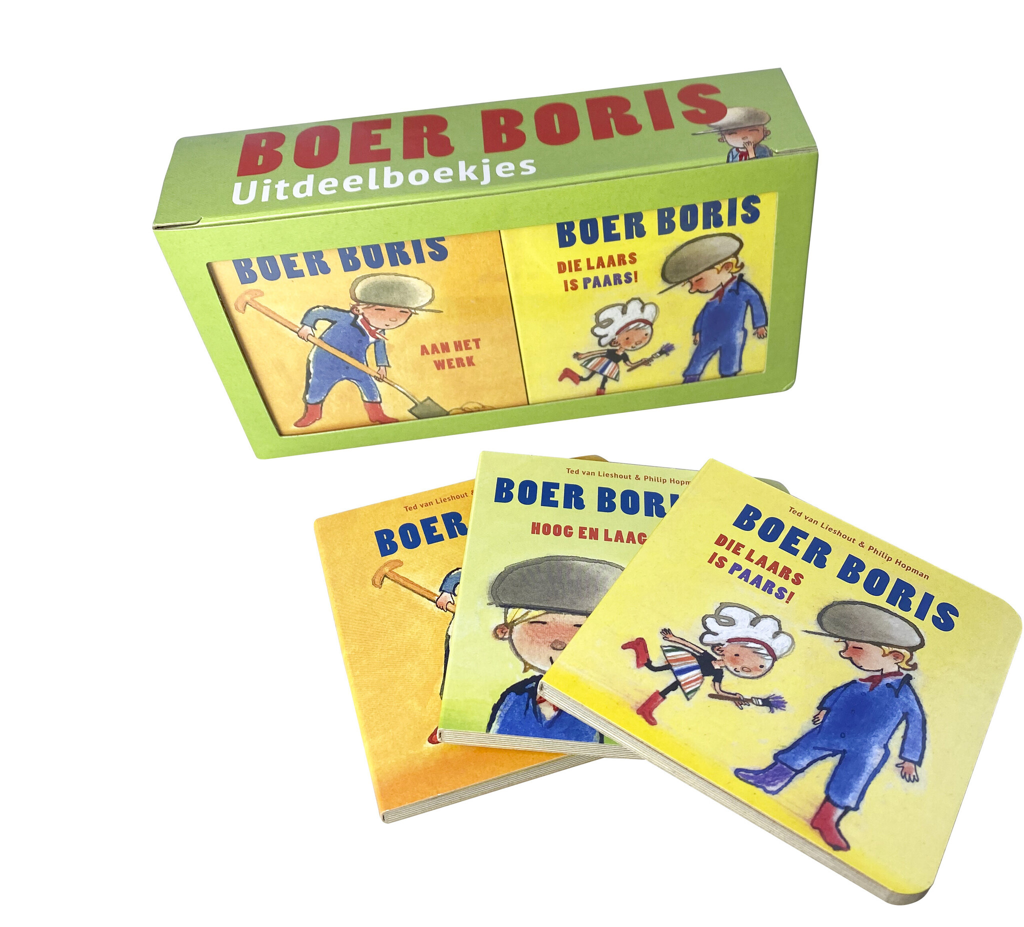 Boer Boris kartonnen uitdeelboekje. Uitgevoerd in 4 verschillende titels; 'Aan het werk', 'Die laars is paars', 'Met zijn drietjes' en 'Hoog en laag'. Leuk om uit te delen!
