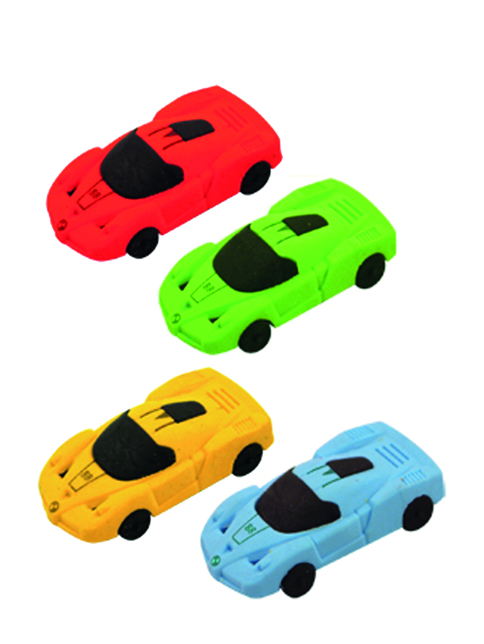 Vrolijke gekleurde gummetjes in de vorm van een auto, perfect als weggeefcadeautje voor kinderen. Verkrijgbaar in diverse kleuren en met een formaat van ca. 5,5 cm. Assorti geleverd.