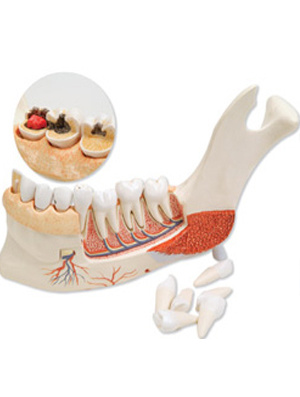 Het voorste gedeelte van het bot en alle tanden zijn verwijderbaar. Een snijtand met overlangse doorsnede. De zenuwen, bloedvaten en de klieren onder de tong en kaak worden weergegeven. De aangetaste tanden geven de verschillende stadia van cariës weer. Aan de hand van dit model kunt u gemakkelijk uitleggen waarom tandhygiëne zo belangrijk is.