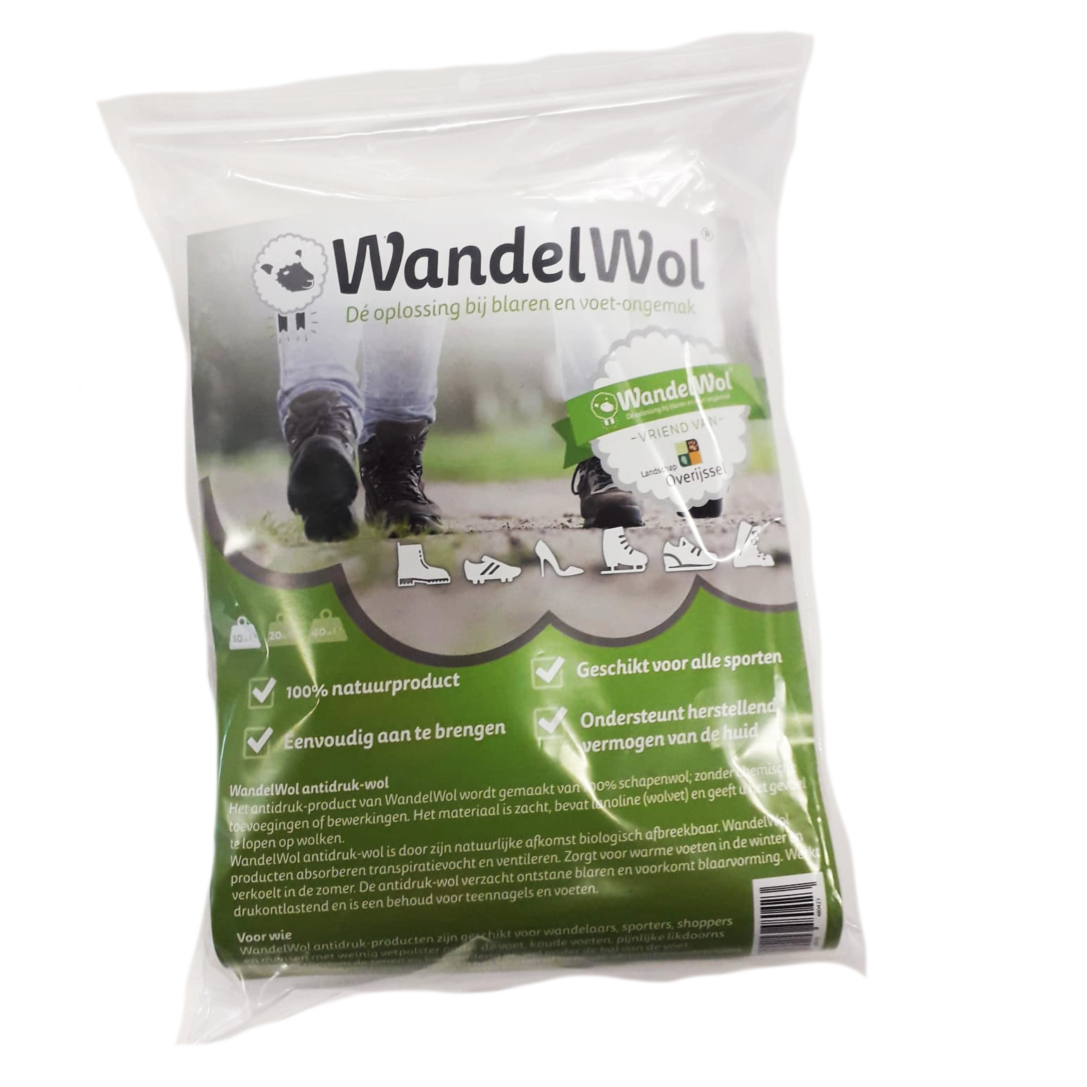 Wandelwol-wol absorbeert transpiratievocht en ventileert. WandelWol-wol zorgt voor warme voeten in de winter en verkoelt in de zomer. Wandelwol-wol verzacht ontstane blaren en voorkomt blaarvorming. Werkt druk-ontlastend en huidherstellend bij eeltlocaties, likdoorns tussen, onder en op de tenen, verlicht de druk bij pijnlijke wratten, wintertenen, etc.