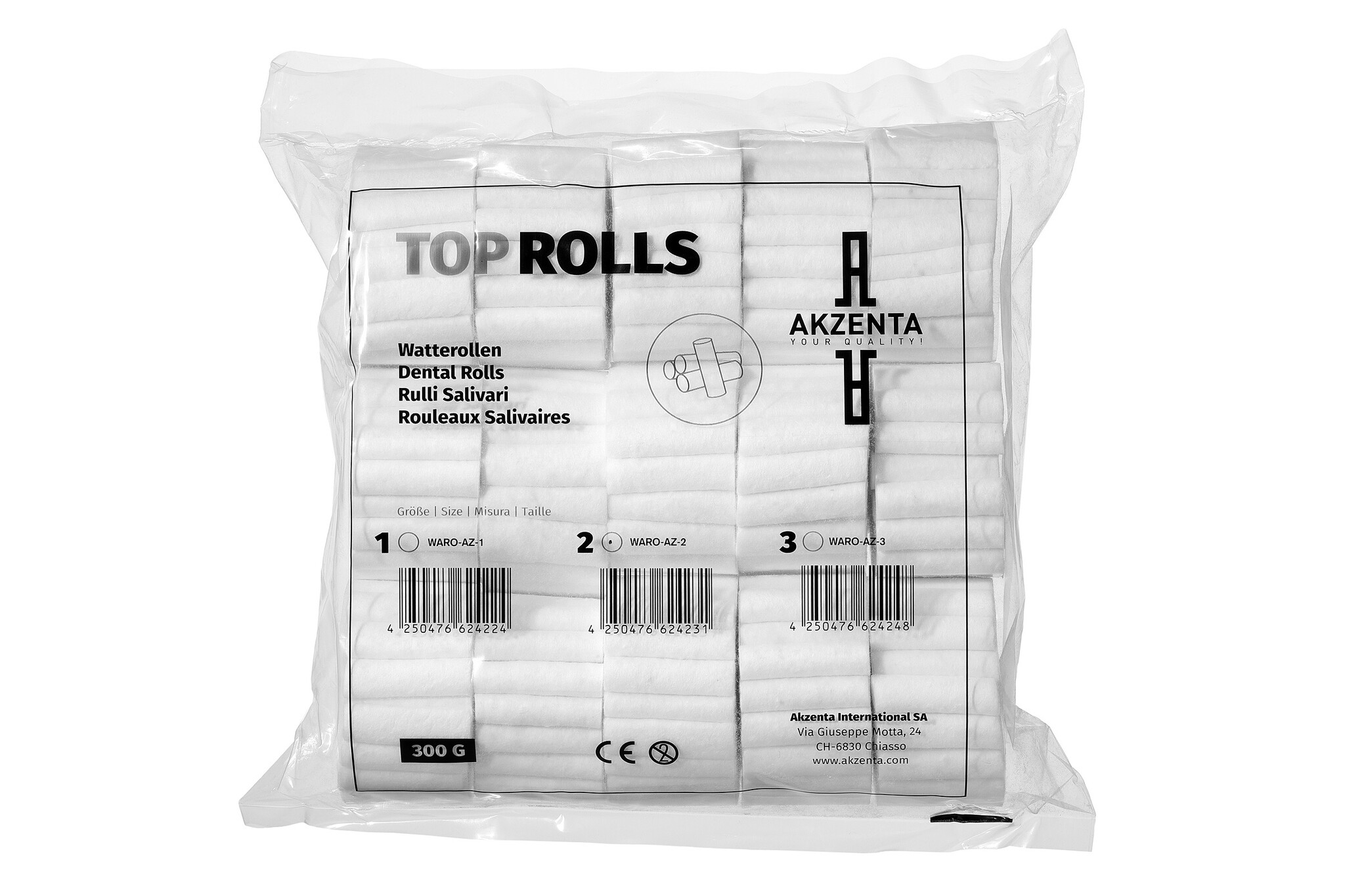 Wattenrollen van 100% puur katoen, autoclaveerbaar bij 121 c / 20 minuten, plakt niet aan de mond, 100% huidvriendelijk. Zak bevat 15 bundels van 56 rolletjes= 840 stuks totaal = 300 gram