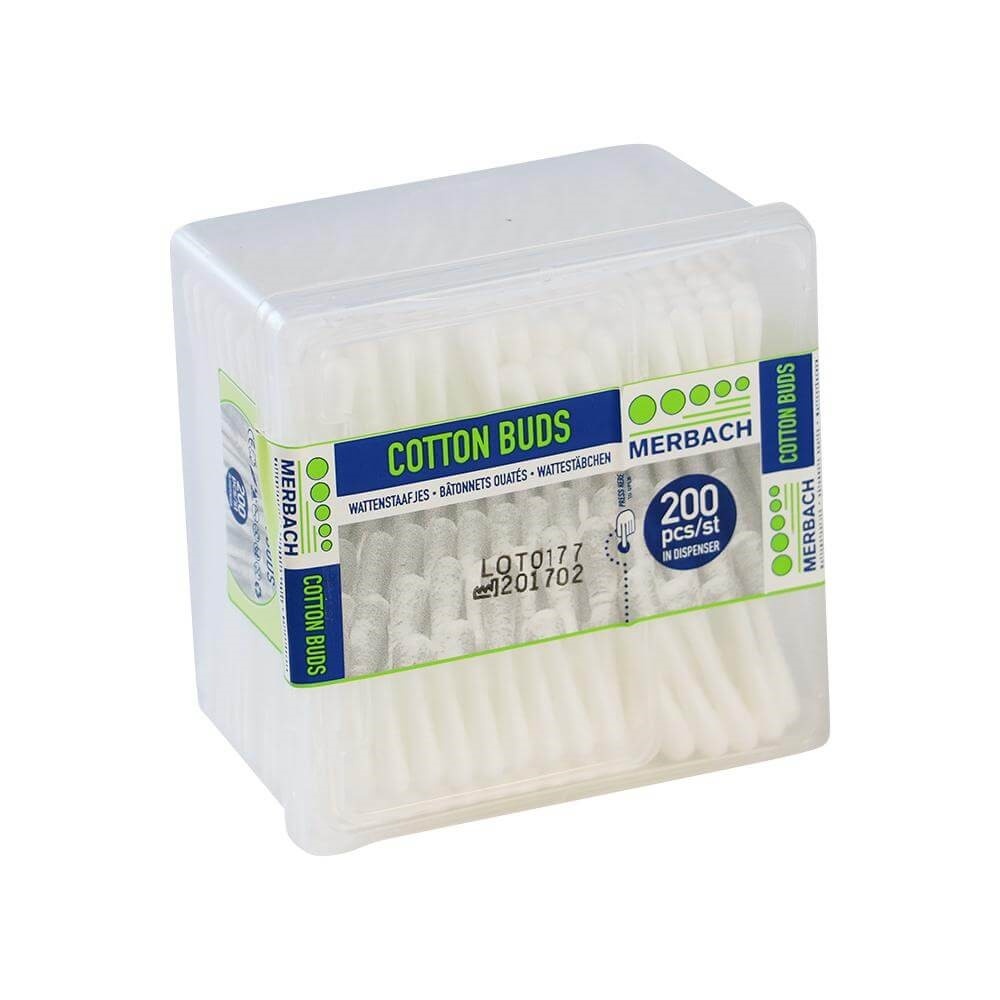Katoenen wattenstaafjes 200 stuks in handig dispenserdoosje.