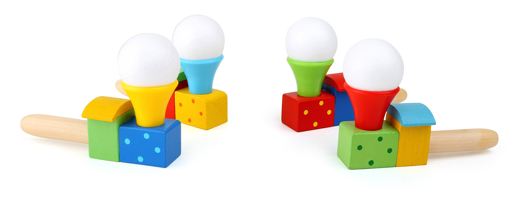 Een zwevende ballentrein nadert. De grote schoorsteen zorgt ervoor dat de lichte piepschuimbol blijft zweven. De kleine houten pijp voert de lucht door de schoorsteen naar de bal die als bij toverslag in de lucht zweeft. Het is belangrijk dat je niet te hard en niet te zacht blaast.